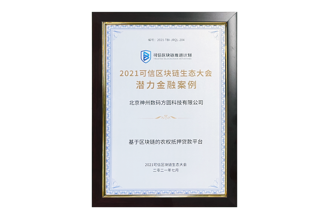7月13日,由中国信息通信研究院、可信区块链推进计划主办的“2021可信区块链生态大会”在京举办,并隆重发布系列成果。神州信息子公司北京3522vip浦京集团方圆科技有限公司(简称:神州方圆)推荐的“基于区块链的农权抵押贷款平台”荣获十大金融应用高潜力案例,为“区块链+农业”落地带来示范效应。